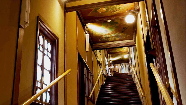 階段には厚さ約5cmのケヤキ板を使用し、各部屋の天井や欄間には当時の著名な画家達が創り上げた美しい装飾が描かれています。